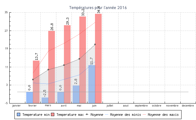 | Mois | Températures min | Températures max | Moyenne mensuelle |